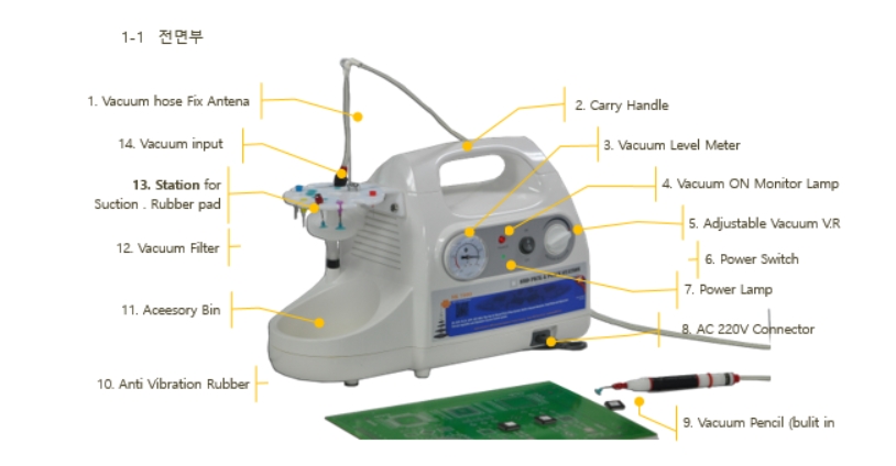 본 장비는 SMD " Pick and Placement " Station으로 그간 SMD Move 시 핀셋 등을 통하여 작업을 보다 효율적인 작업을 위하여 SMD 부품을 Vacuum Pick-up 할 수 있는 장비입니다.